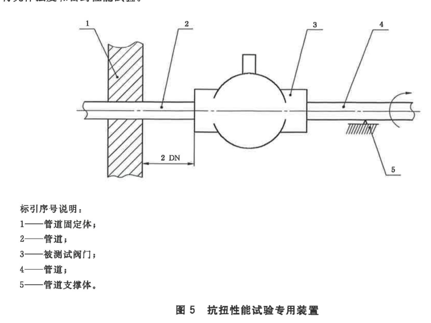 抗扭性能試驗 抗扭性能試驗裝置如圖5所示,將被測試閥門3按圖5所示位置固定在裝置上,管道4應(yīng)支撐好使其不會產(chǎn)生彎曲力矩,按6.19規(guī)定的扭矩值平穩(wěn)地逐漸施加到管道上,保持10s。最后按規(guī)定進行殼體強度和密封性能試驗。