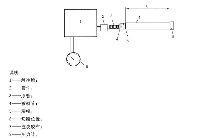 將規(guī)定長(zhǎng)度的被覆管連接到緩沖槽上,緩沖槽容積大于或等于10L,將被覆管在緩沖槽一側(cè)管的被覆剝離,用膠帶等將被覆層與原管密封住,另外一端用端帽堵住,確認(rèn)配管整體的氣密保持在3kPa以上,從被覆管的末端算起,在規(guī)定長(zhǎng)度的位置(即切斷位置),將測(cè)試軟管用剝離刀剝離約1cm寬度的被覆層,當(dāng)連接帶泄漏檢測(cè)功能的管件時(shí),可不剝離被覆層。配管整體的內(nèi)壓在3kPa時(shí),測(cè)量1min的壓力下降量,確認(rèn)其數(shù)值應(yīng)在150Pa以上為合格。