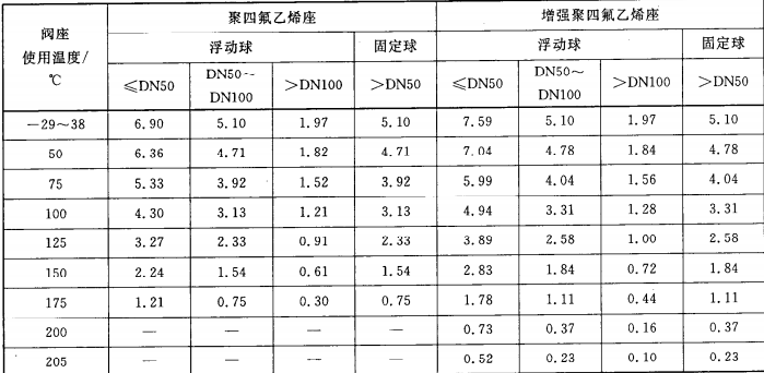 - 球閥閥座和密封件材料使用聚四氟乙烯或增強(qiáng)聚四氟乙烯時,球閥閥座和密封件材料的允許工作壓力——溫度額定值按照下表的規(guī)定: