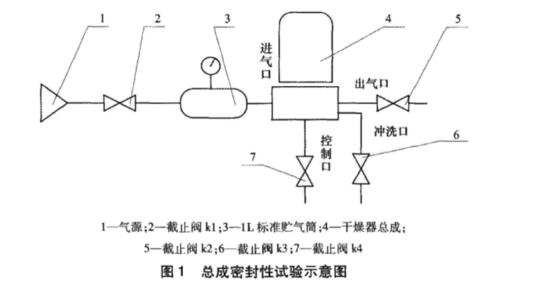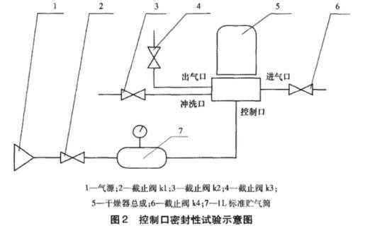 將被試干燥器總成樣品按圖2所示連接,關閉截止閥k2,開啟截止閥k3和k4,然后從進氣口通人規(guī)定的試驗壓力的壓縮空氣,待壓力穩(wěn)定后,關閉截止k,穩(wěn)壓5min后,記錄隨后5min內的壓力降。