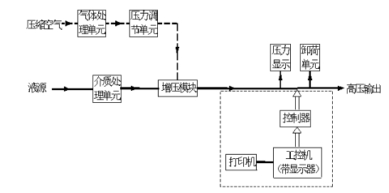 液體增壓單元是根據(jù)用戶的實(shí)際需求設(shè)計(jì)的一種新型試壓裝置,,主要的作用是能夠控制設(shè)備的啟停,可針對于不同的測試壓力,進(jìn)行計(jì)算機(jī)設(shè)定,可實(shí)現(xiàn)到壓力自動(dòng)停機(jī),實(shí)時(shí)觀察測試數(shù)據(jù),輸出測試報(bào)告,設(shè)備根據(jù)客戶的要求添加了強(qiáng)制性手動(dòng)泄壓閥,可針對于測試過程中出現(xiàn)的意外進(jìn)行強(qiáng)制性泄壓,系統(tǒng)工作原理及流程如圖所示。