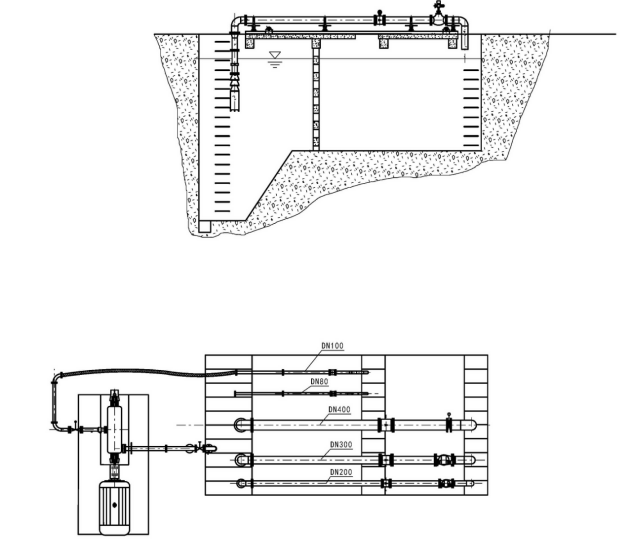 潛水泵試驗(yàn)管路有DN200、300、400mm三條,置于水池頂部蓋板上對(duì)于泵出口直徑與管路口徑不同的產(chǎn)品,在泵出口測(cè)壓管后加變徑管連接,水池頂部蓋板應(yīng)考慮被試泵及管路承重。