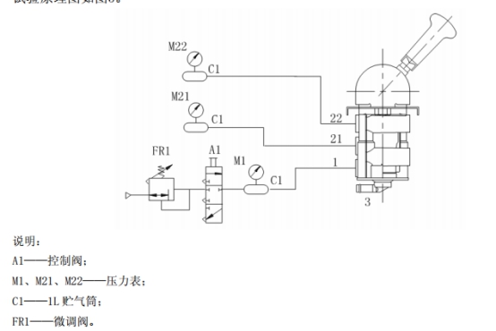 2.1 將被測(cè)樣品手柄置于行車位置。打開控制閥 A1,從被測(cè)樣品進(jìn)氣口充氣至 PE+50 0 。關(guān)閉控制閥 A1 截?cái)鄽庠?,穩(wěn)定 1min 后,記錄 5min 內(nèi)壓力表 M1、M21、M22 的壓力降。