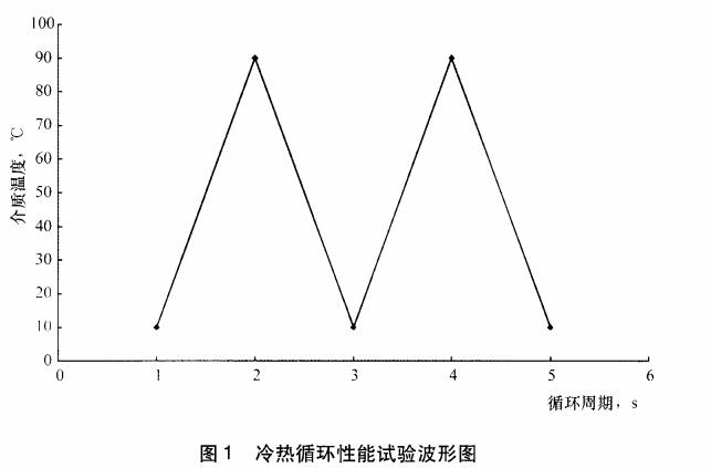 將散熱器內部通人50%的乙二醇和50%的水(體積比),商用車散熱器施加以100kPa土20kPa的壓力,乘用車散熱器施加以150kPa士20kPa的壓力進行2000次109-90C--10C溫度交變循環(huán).(見圖1所示) , 循環(huán)頻率為3~ 15次每小時, 溫度控制精度為士3C。試驗后按規(guī)定進行密封性能檢測。