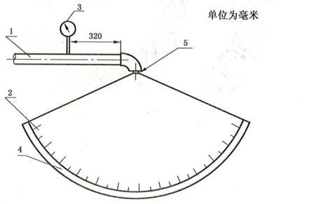 試樣數(shù)量為3只,試驗(yàn)裝置如圖2所示,將噴頭安裝在試驗(yàn)裝置的回轉(zhuǎn)中心線上,使霧化角頂點(diǎn)位 于集水器所在的圓弧的中心。試驗(yàn)壓力為0.35MPa,待壓力穩(wěn)定后,由裝置的角度刻度盤讀出噴灑的 主水流在集水器內(nèi)所形成的夾角的角度值,即霧化角。每個(gè)試樣的測(cè)量結(jié)果均應(yīng)符合規(guī)定。
