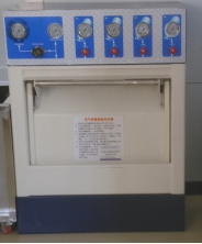 該充氣箱用于防止在充氣過程中因充氣接頭脫離、充氣管斷裂和氣瓶爆破等意外事故發(fā)生時對操作人員造成傷害。防護箱整體采用6毫米鋼板焊接而成,兩邊有平衡卸壓孔;箱門采用6毫米鋼板折彎成拱形結(jié)構(gòu),內(nèi)襯3毫米折彎鋼板;開門自動切斷充氣回路,關(guān)門時自動打開充氣回路;采用跌落式關(guān)門自鎖裝置,自鎖十分靈活可靠,能有效防止充瓶時及氣瓶爆破時門被打開。氣瓶托架采用旋轉(zhuǎn)結(jié)構(gòu),配有氣動彈簧,開關(guān)箱門時能有效減輕操作人員勞動強度;充氣時氣瓶放在軟性塑料筒中,不會劃傷氣瓶表面。它是充氣維修室的主要設(shè)備。 ?????