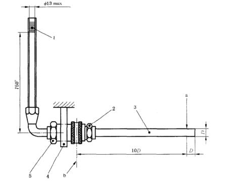 1 將接頭總成裝入試驗(yàn)裝置中。以試驗(yàn)液體(見(jiàn)6.2)注入試驗(yàn)裝置至750mm的液柱高度。在距離鎖定裝置的測(cè)量棒的軸線為10D處,施加50N載荷垂直于接頭中心線,見(jiàn)下圖。D等于GB/T2351中的軟管公稱內(nèi)徑。