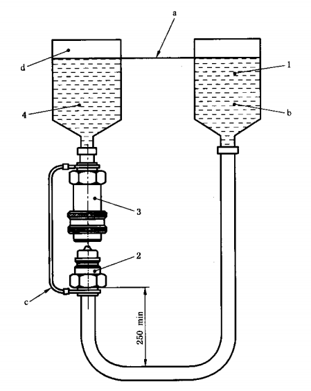 - 如圖所示將接頭總成放入試驗裝置中。 記錄封1和4的液面高度,兩個液面a應一致。